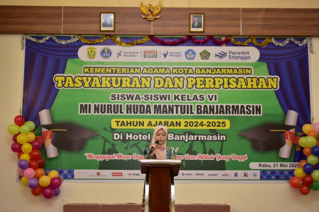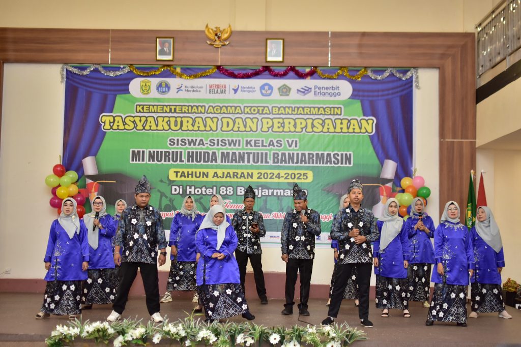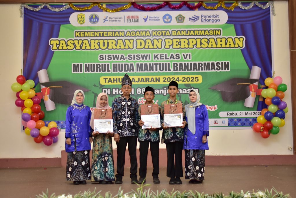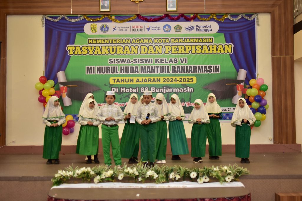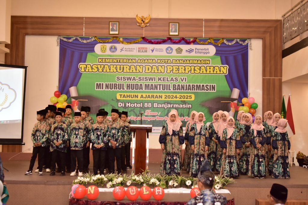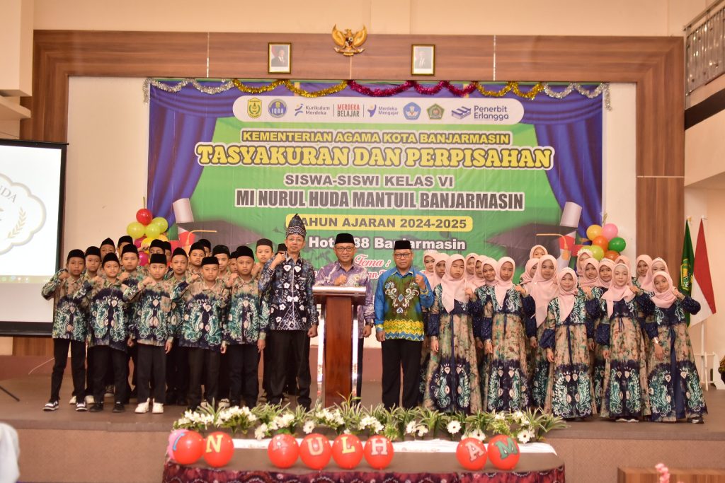 Banjarmasin— MI Nurul Huda Mantuil menggelar acara Tasyakuran dan Perpisahan bagi siswa kelas 6 angkatan ke-34 pada Rabu, 21 Mei 2025, bertempat di Hotel 88. Acara ini berlangsung dengan penuh kekhidmatan dan kehangatan, serta dihadiri oleh para wali murid, dewan guru, dan tamu undangan, termasuk Kepala Kementerian Agama, Bapak H. Saipudin, S.Ag, M.Pd.I.