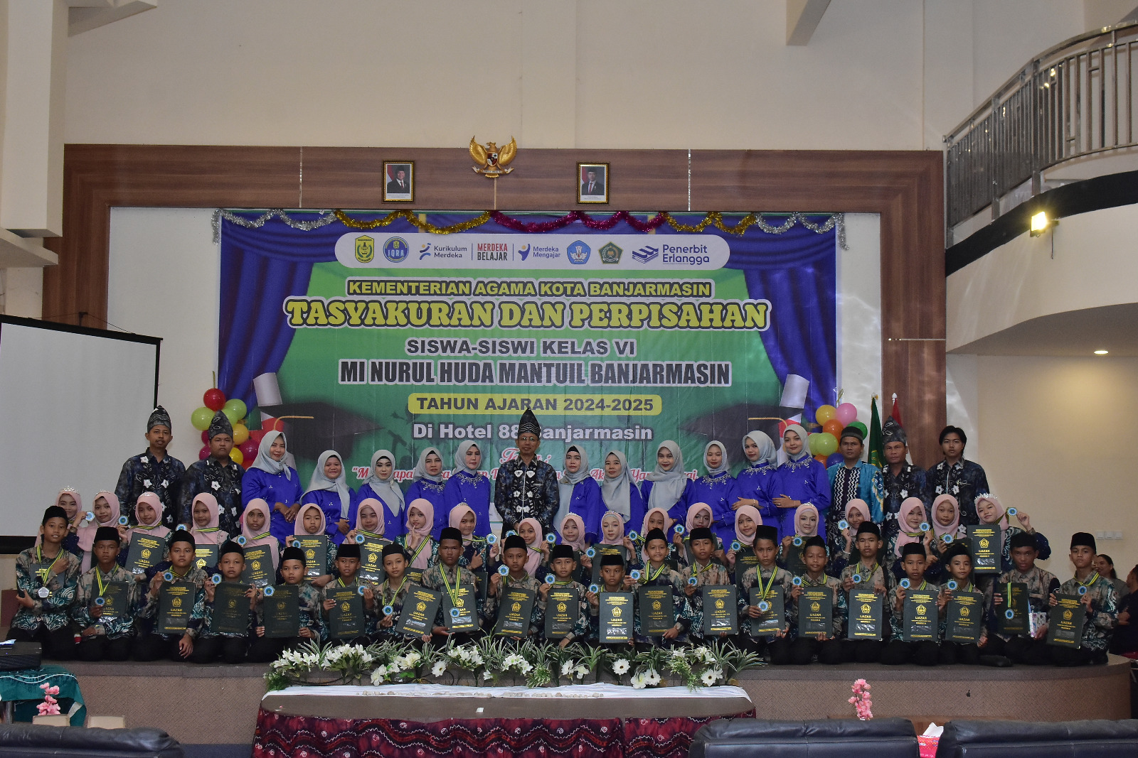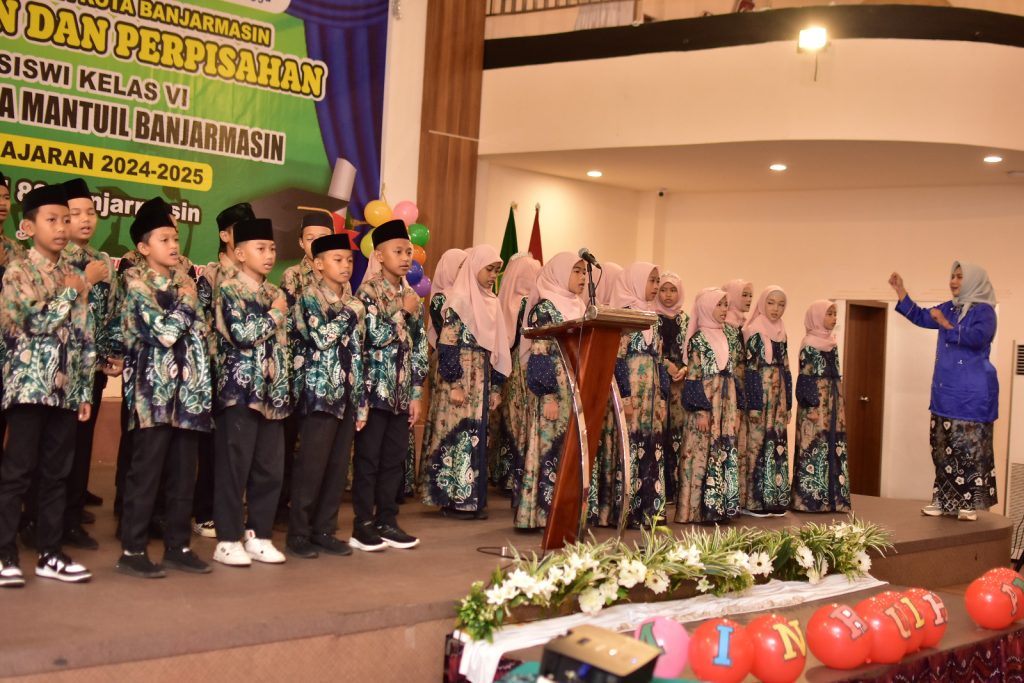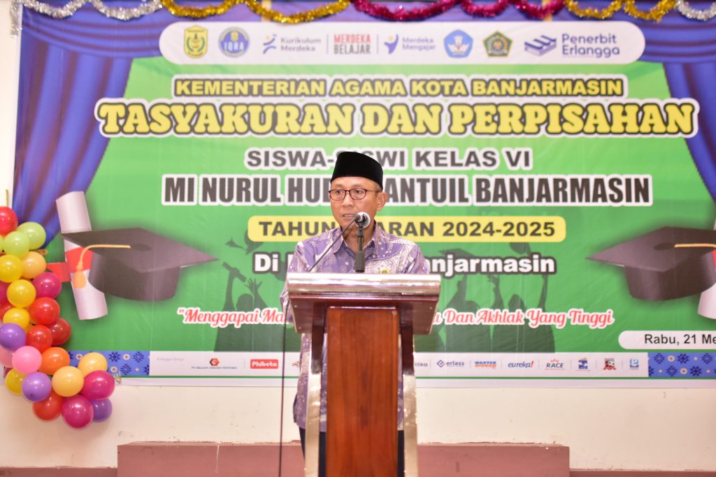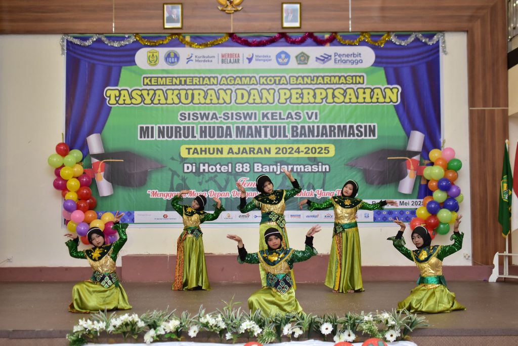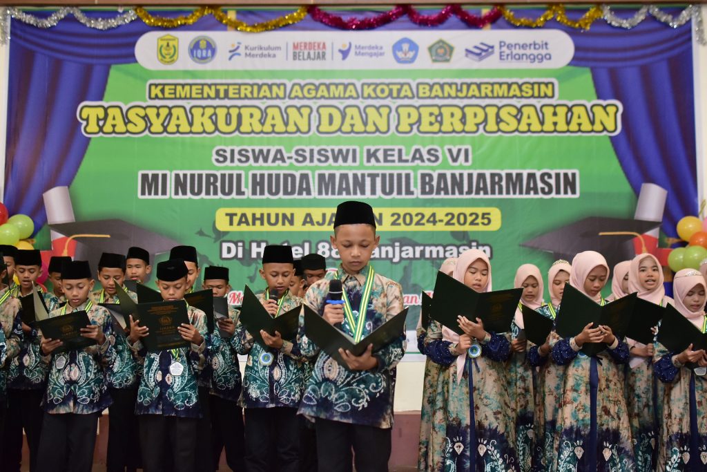 Banjarmasin— MI Nurul Huda Mantuil menggelar acara Tasyakuran dan Perpisahan bagi siswa kelas 6 angkatan ke-34 pada Rabu, 21 Mei 2025, bertempat di Hotel 88. Acara ini berlangsung dengan penuh kekhidmatan dan kehangatan, serta dihadiri oleh para wali murid, dewan guru, dan tamu undangan, termasuk Kepala Kementerian Agama, Bapak H. Saipudin, S.Ag, M.Pd.I.