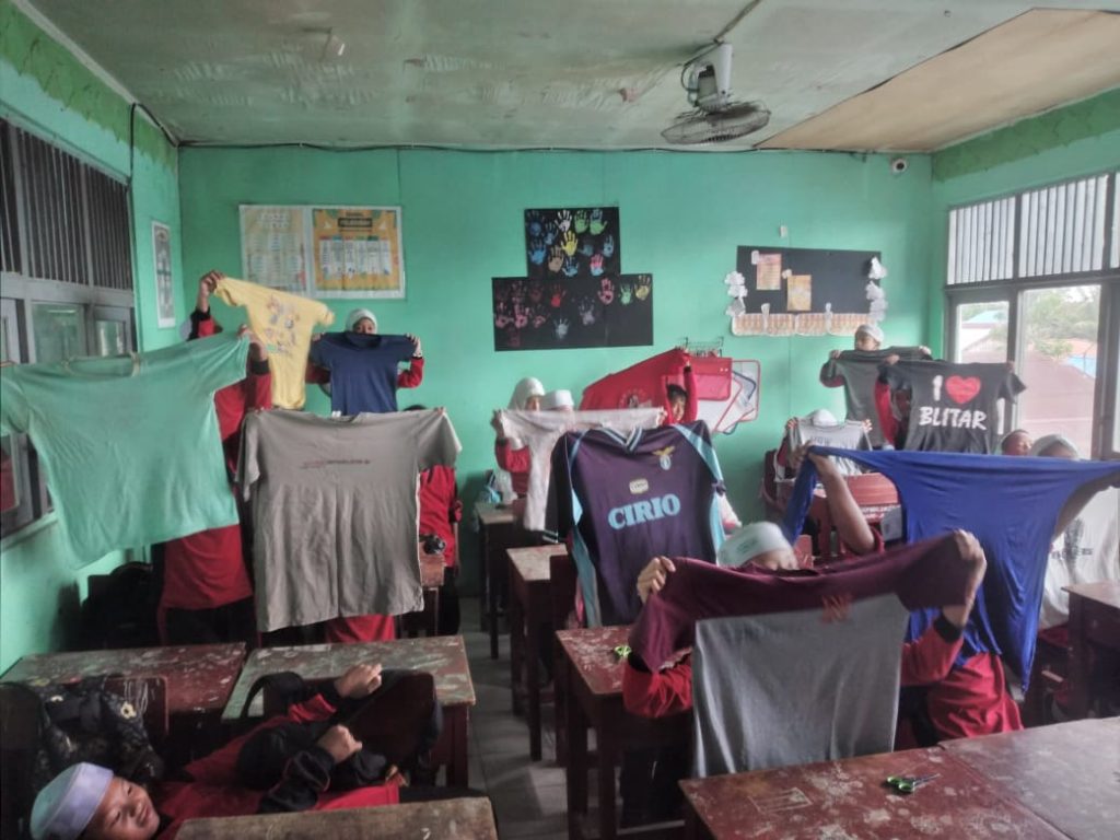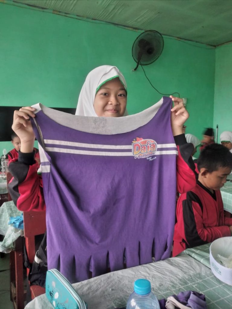 Dalam kegiatan ini, siswa diminta membawa baju bekas dari rumah dan kemudian mereka diajak untuk membuat tas belanja dari bahan tersebut. Dengan bantuan gunting, siswa sangat antusias dan bergembira saat memotong dan merakit baju bekas menjadi tas yang unik dan berguna.