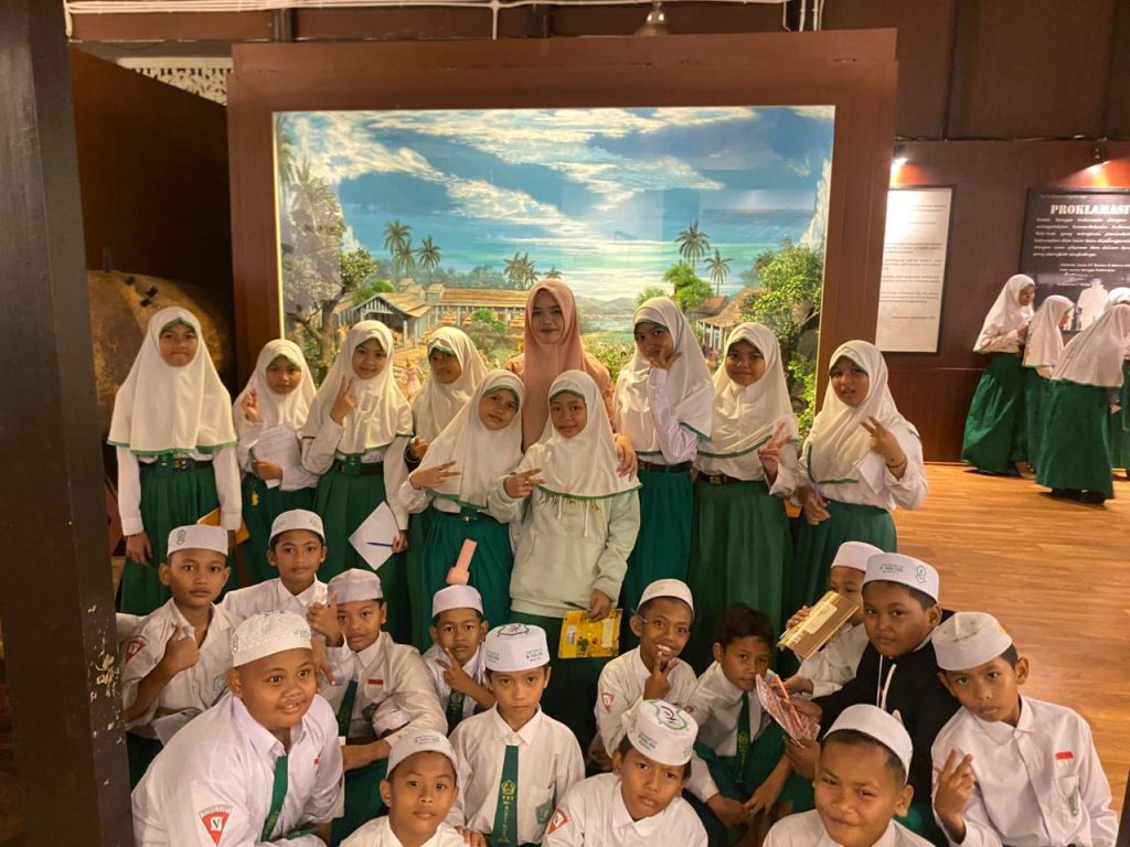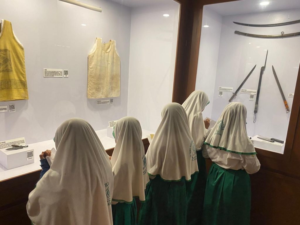 Wali Kelas 5 MIS Nurul Huda Mantuil, yang mendampingi langsung rombongan, menjelaskan pentingnya melihat bukti sejarah secara fisik.